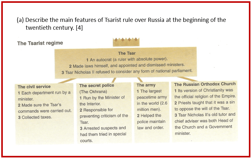 Describe the main features of Tsarist rule over Russia at the beginning of the twentieth century. [4]