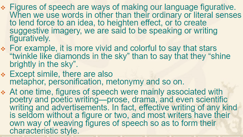 Let’s now look at figures of speech. Writers make their writing more interesting by using figures of speech. Figures of speech also helps to get a more personal reaction from readers.