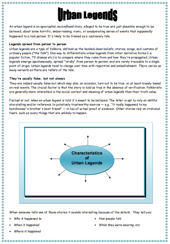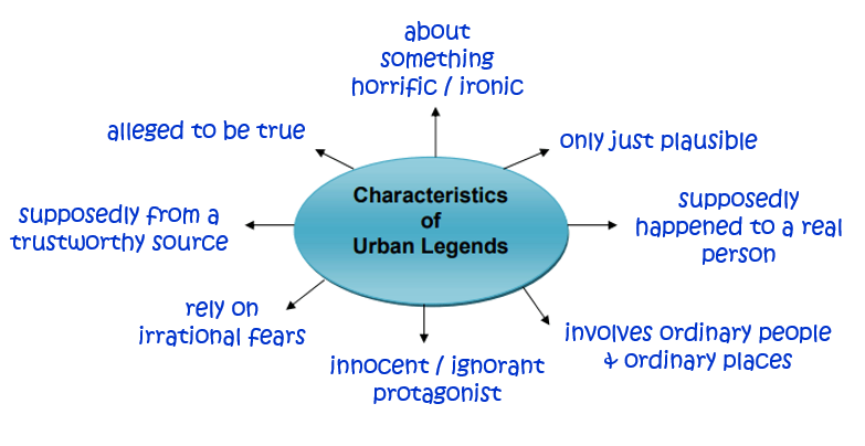 Read the information again and complete the spider diagram to show characteristics of Urban Legends.