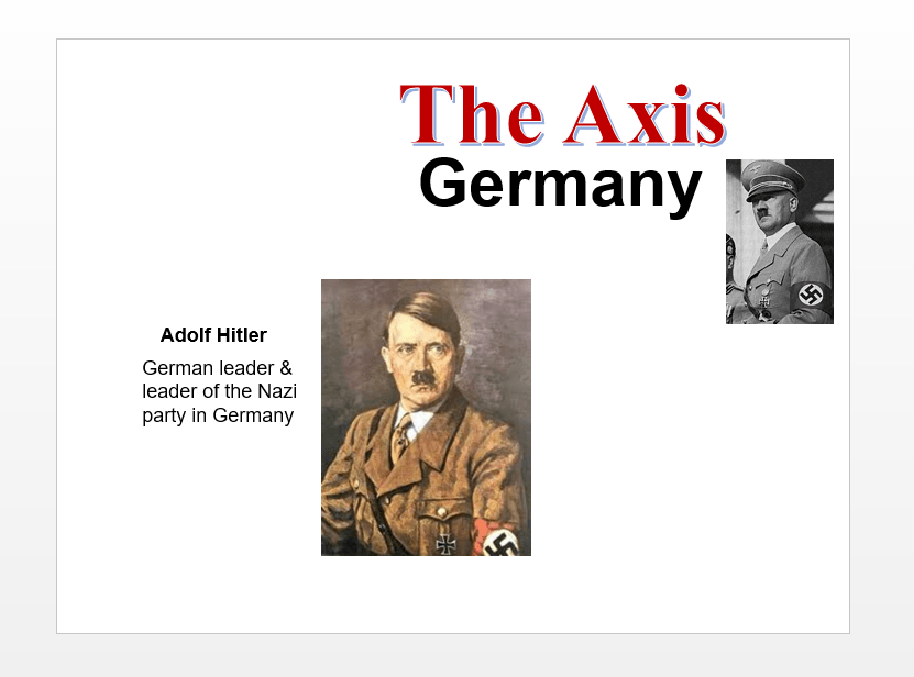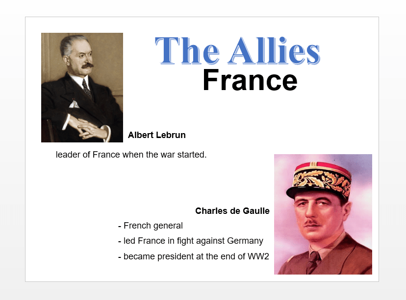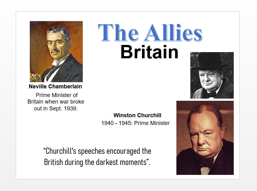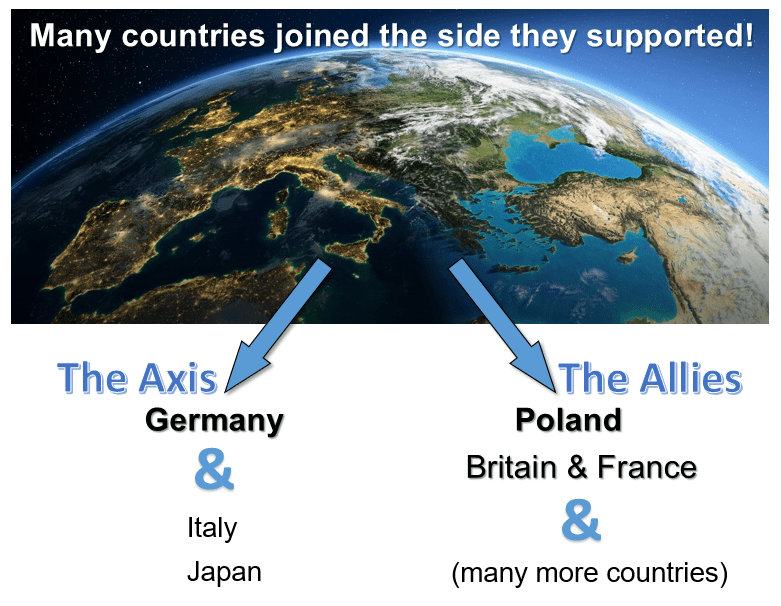 When Britain and France declared war on Germany, many more countries joined to help one of the two sides in the war. Here are the two sides that fought against each other: