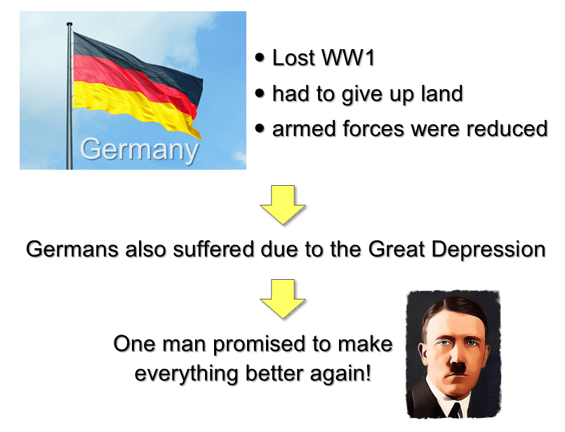 The flowchart below shows how Germany had some grievances after WW-1, which eventually led to WW-2.