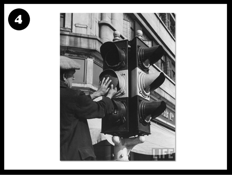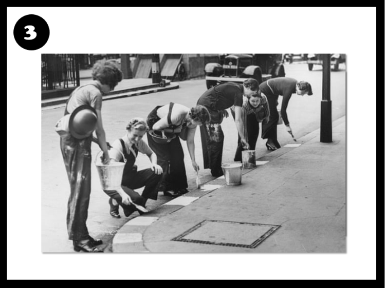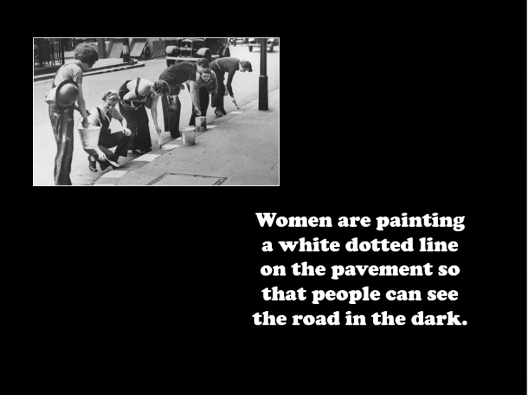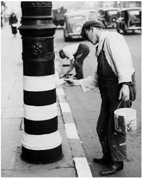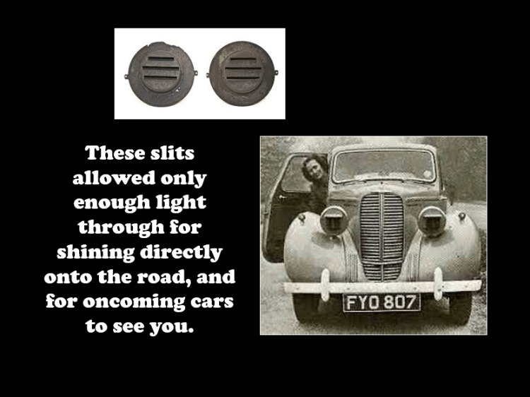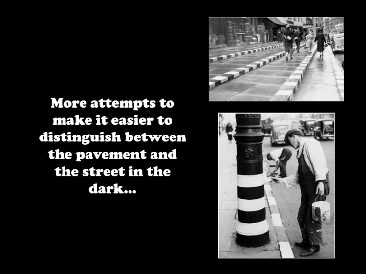 In addition, white stripes were painted on the roads and on lamp-posts, and men were advised to leave their shirt-tails hanging out so that they could be seen by cars with dimmed headlights.