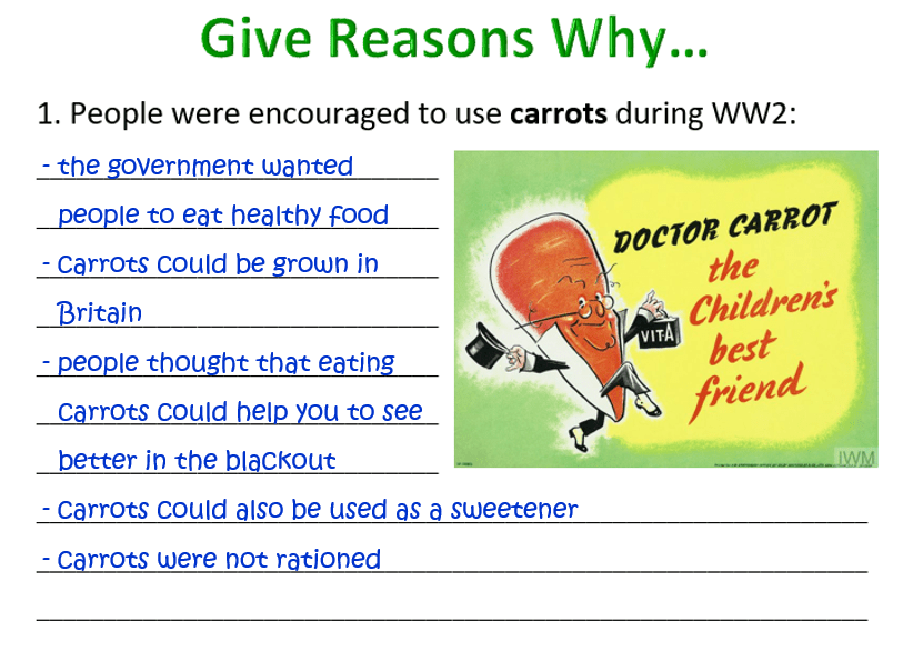 Food was in short supply but the government wanted people to eat healthy food. Carrots could be grown in Britain, so were not rationed. People thought that eating carrots could help you to see better in the blackout. Carrots could also be used as a sweetener.
