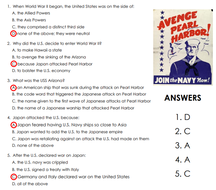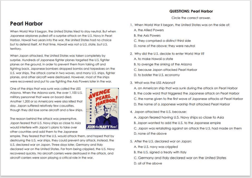Read the article on Pearl Harbour and then complete the Quiz Questions.