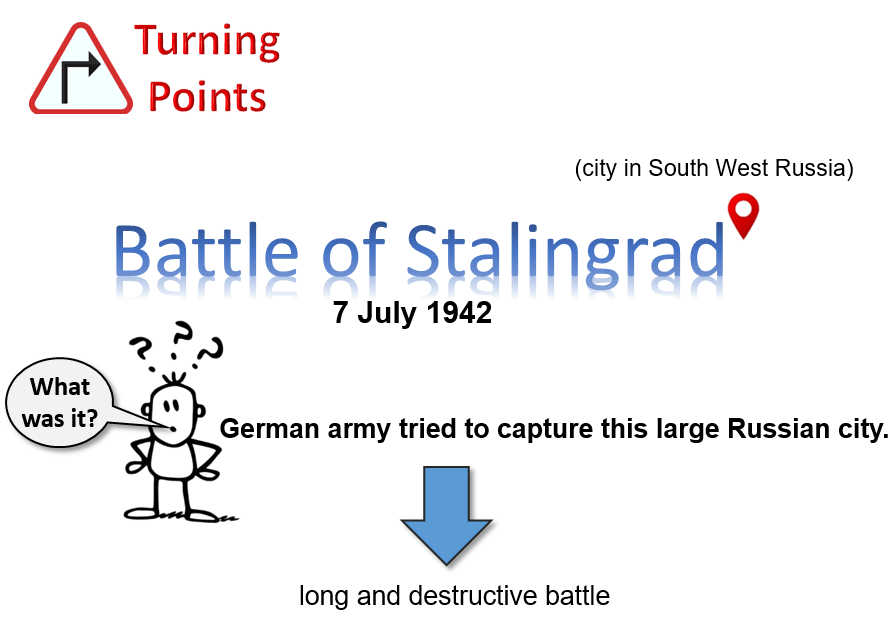 The Battle of Midway was a turning point in the war. So was the Battle of Stalingrad. The image below tells briefly what this was about…