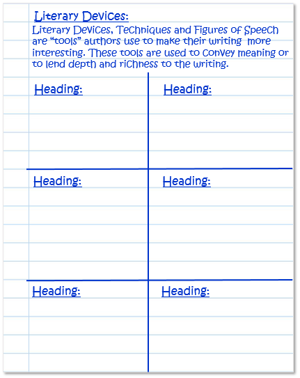 Now, divide the rest of the page into 6 boxes and copy down the details for each of the Literary Devices that you and your partner worked with.