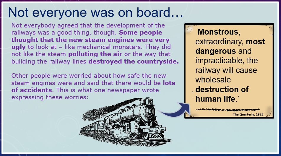 Then also make a list of reasons why people might not have thought that railways were a great change in Britain. (Use the ‘negative’ column on the table.)
