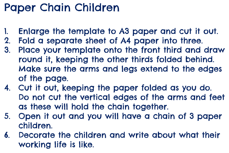 Make a paper chain of three Victorian working children. Each child in your chain represents a different child worker from Victorian times. On each one, write a few sentences about what their work is like. Also decorate their faces and clothes.