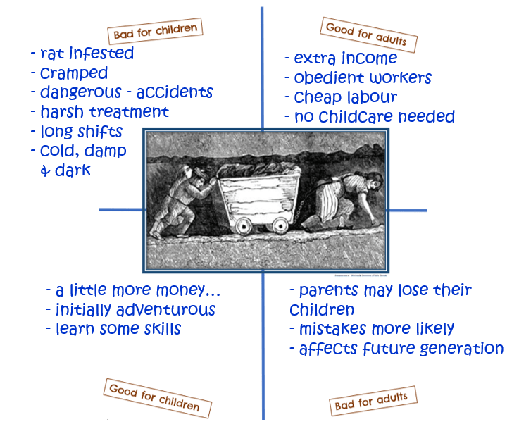 - Make a list of reasons why this kind of work might have been concerning to adults sending their children into mines, or how other adults might feel about the long term effects for this generation of children when they grow up.