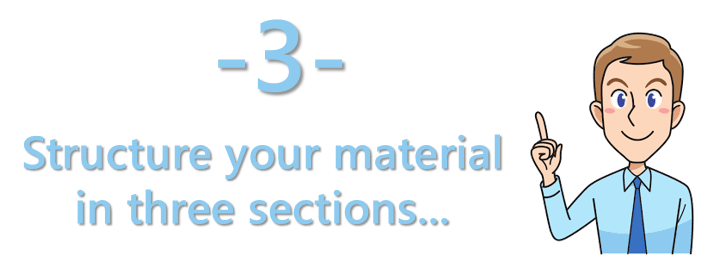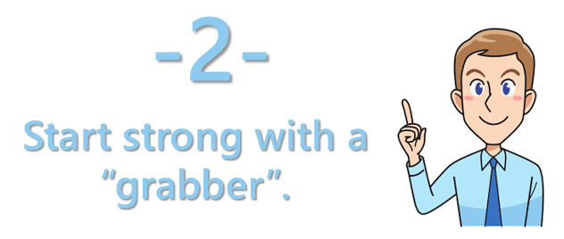 “Begin with a well prepared grabber. A relevant personal story is a great start. It establishes your credibility. It connects you to the audience and creates the right emotional atmosphere (and calms your nerves).”