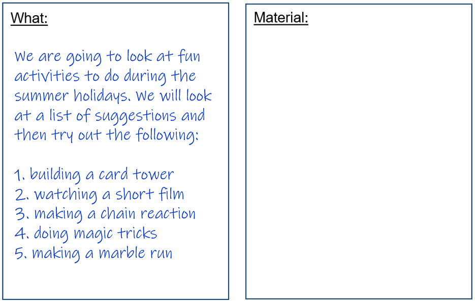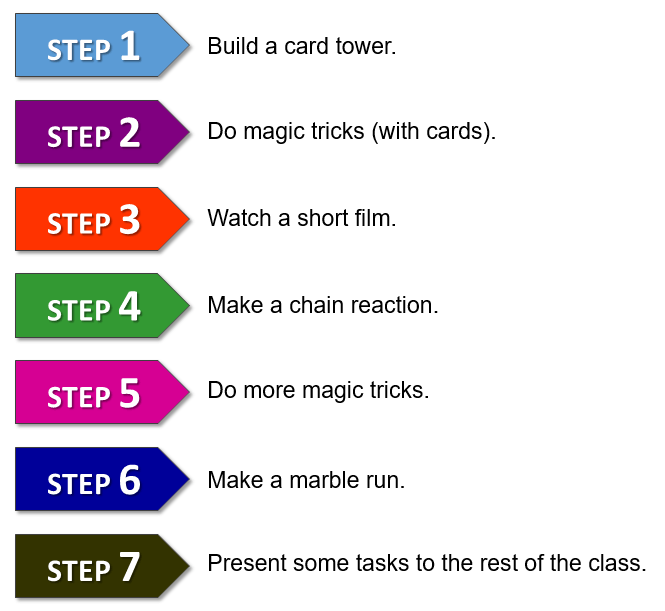 Concept: science of gravity, balance and velocity…. card tower, marble run, chain reaction, magic tricks – and make large marble run