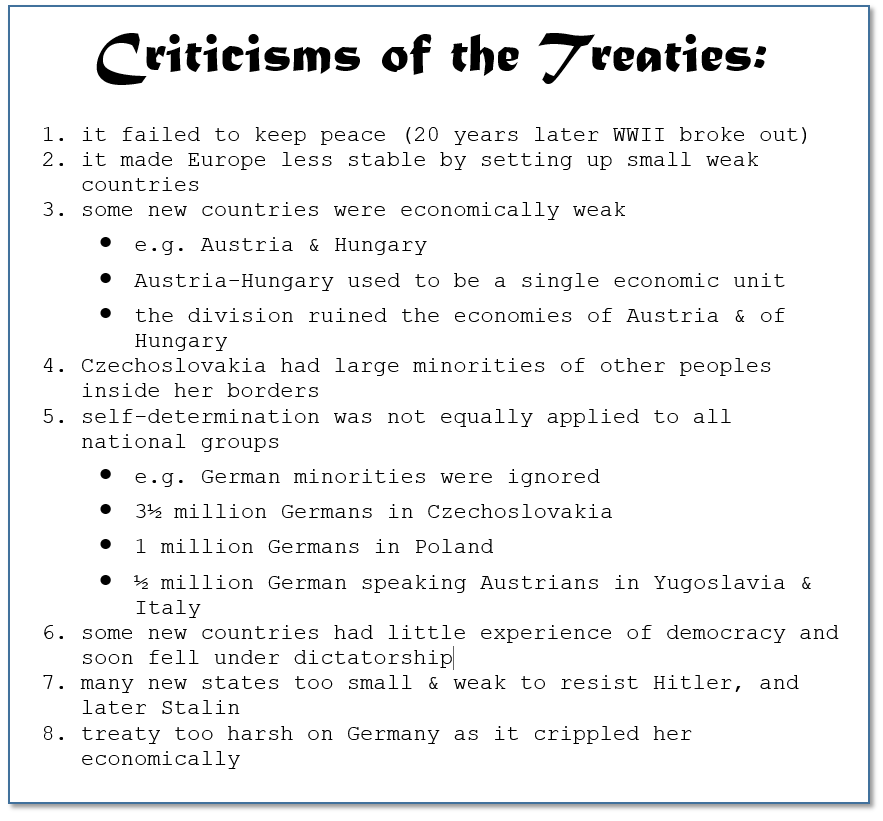 The video below gives a brief overview of why the post-war peace treaties have been criticized… (Pay special attention to points that deal with Germany.)