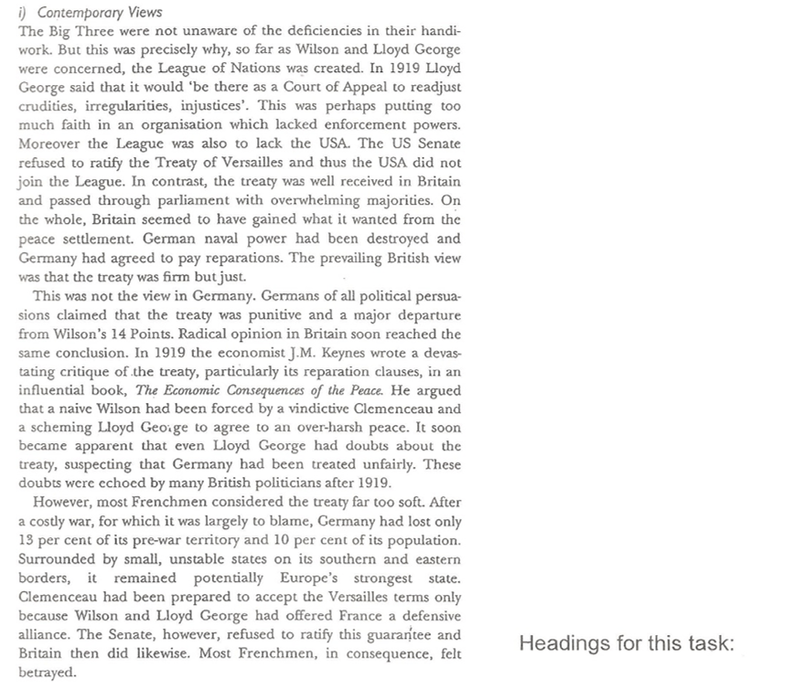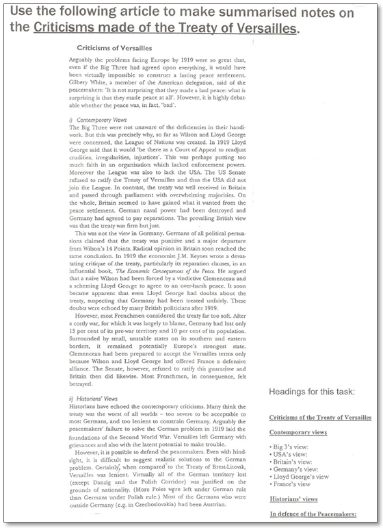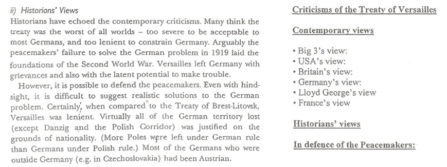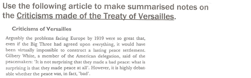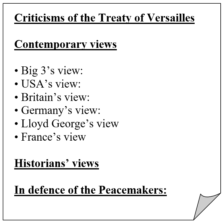 You need to make summarized notes on “Criticisms made of the Treaty of Versailles”. Use the headings in the box below to guide you.