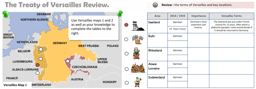 And finally, here are ALL the fill-in answers to the Terms of the Treaty of Versailles again. For revision purposes, see if you can remember the missing information! (Talk yourself through the terms of the Treaty of Versailles!)