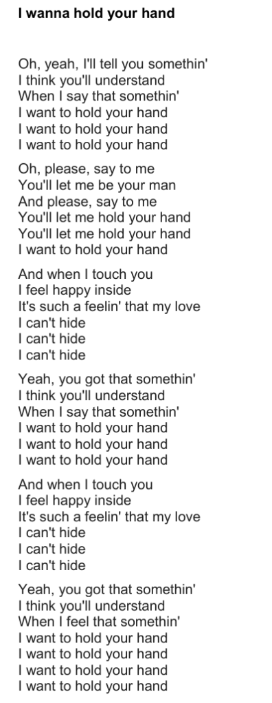 The Beatles – I Wanna Hold Your Hand Lyrics. (2:18 minutes long)
