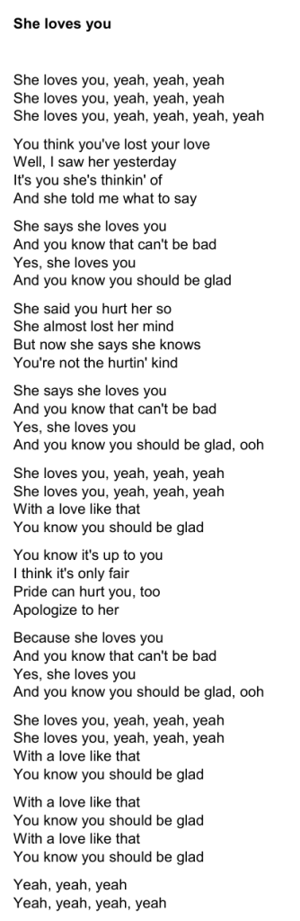 The Beatles – She Loves You Lyrics. (2:17 minutes long)