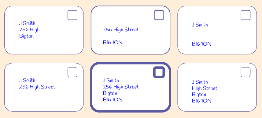 Correct addresses on letters include a name, street name, town, and postcode.