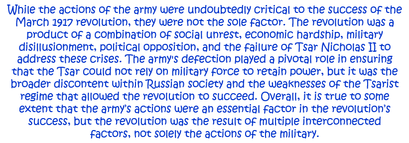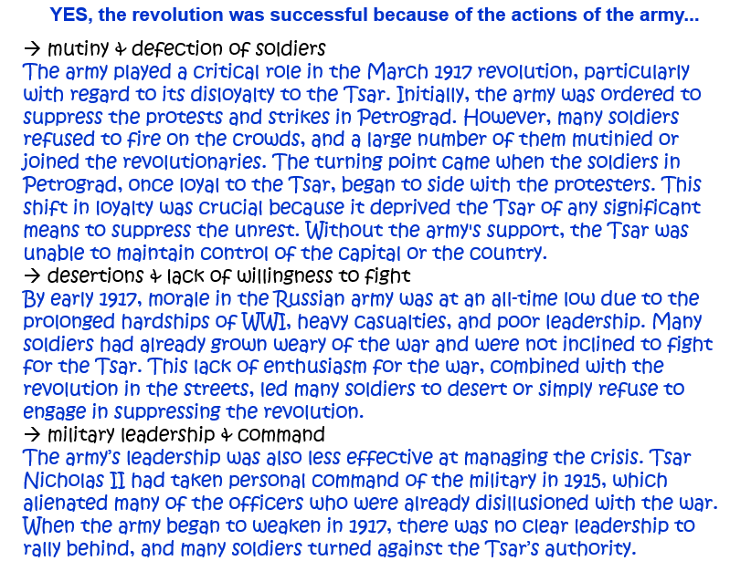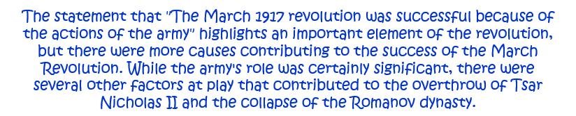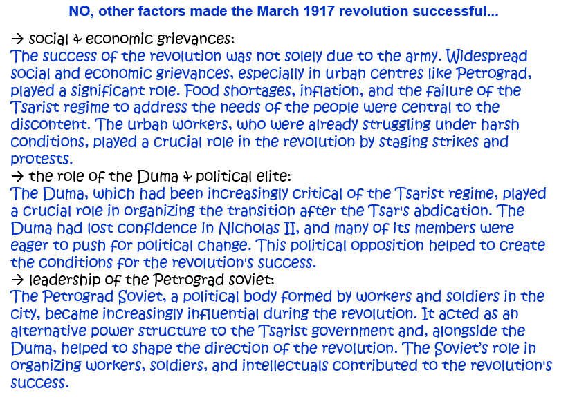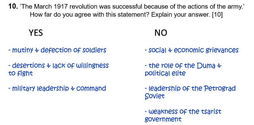 10. ‘The March 1917 revolution was successful because of the actions of the army.’ How far do you agree with this statement? Explain your answer. [10]