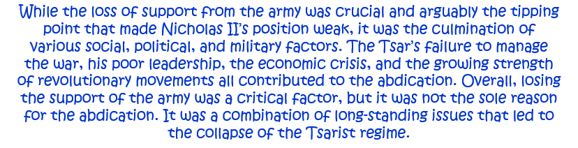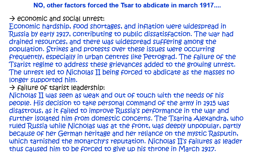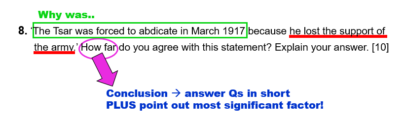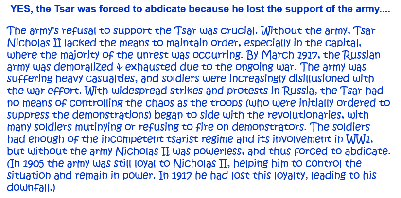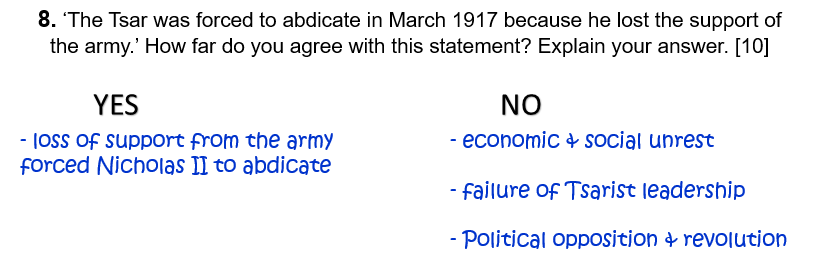 8. ‘The Tsar was forced to abdicate in March 1917 because he lost the support of the army.’ How far do you agree with this statement? Explain your answer. [10]