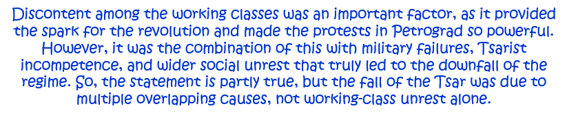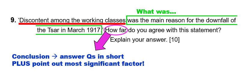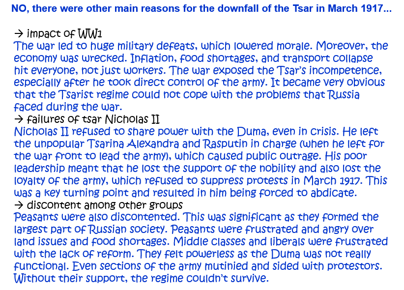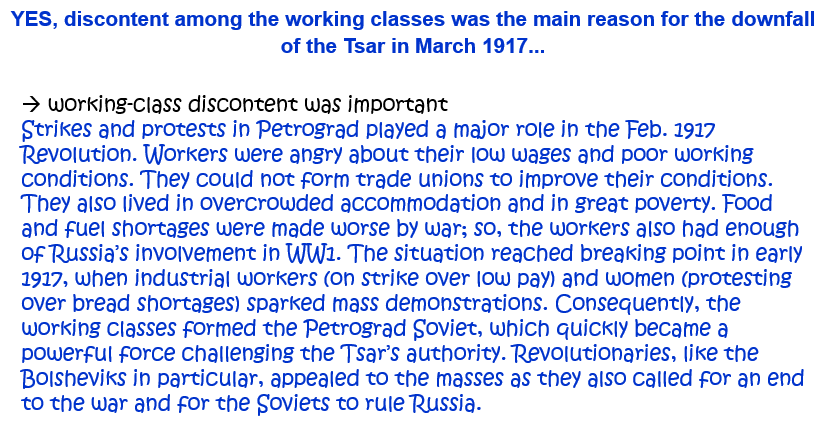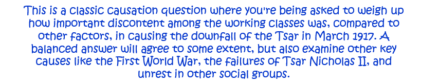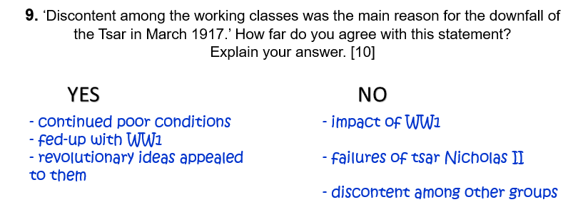 9. ‘Discontent among the working classes was the main reason for the downfall of the Tsar in March 1917.’ How far do you agree with this statement? Explain your answer. [10]