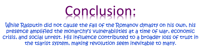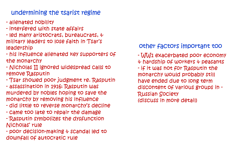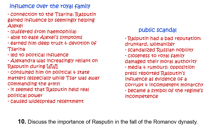 10. Discuss the importance of Rasputin in the fall of the Romanov dynasty.