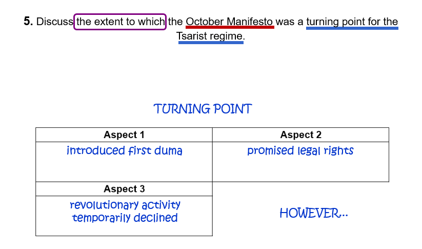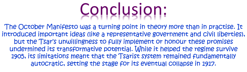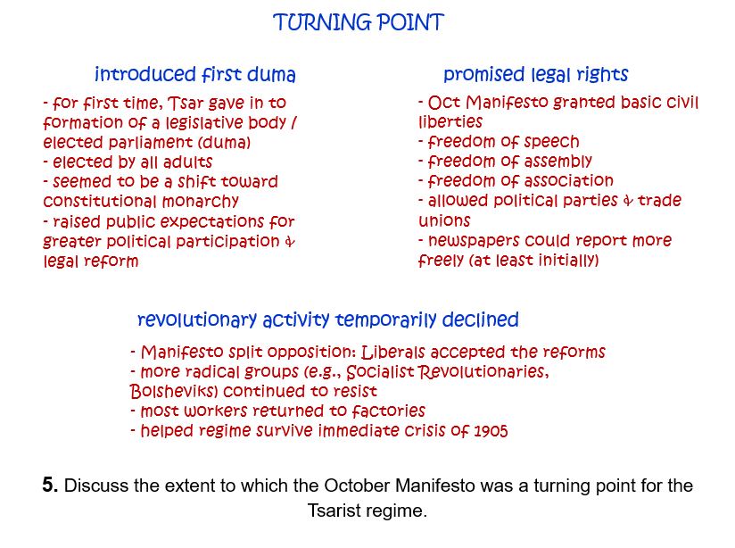 5. Discuss the extent to which the October Manifesto was a turning point for the Tsarist regime.