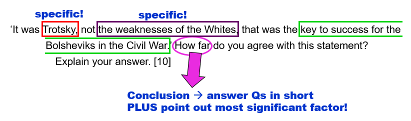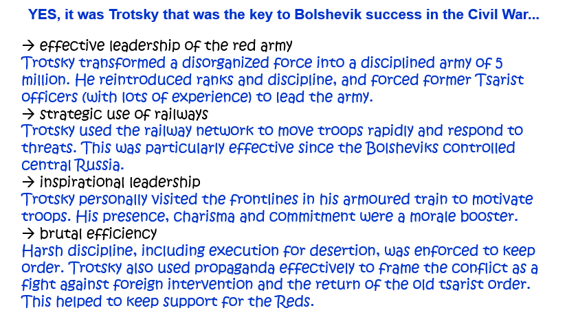‘It was Trotsky, not the weaknesses of the Whites, that was the key to success for the Bolsheviks in the Civil War.’ How far do you agree with this statement? Explain your answer. [10]