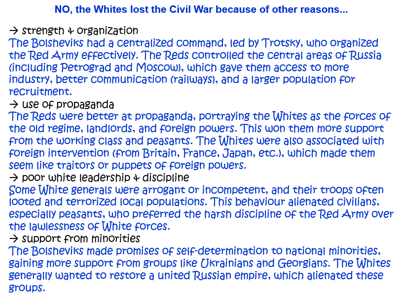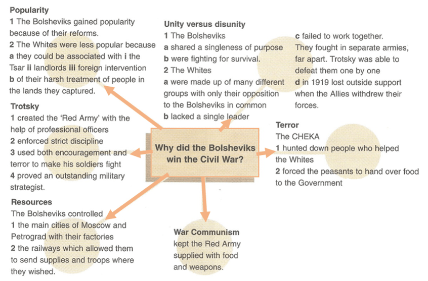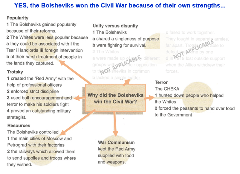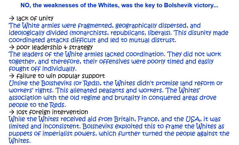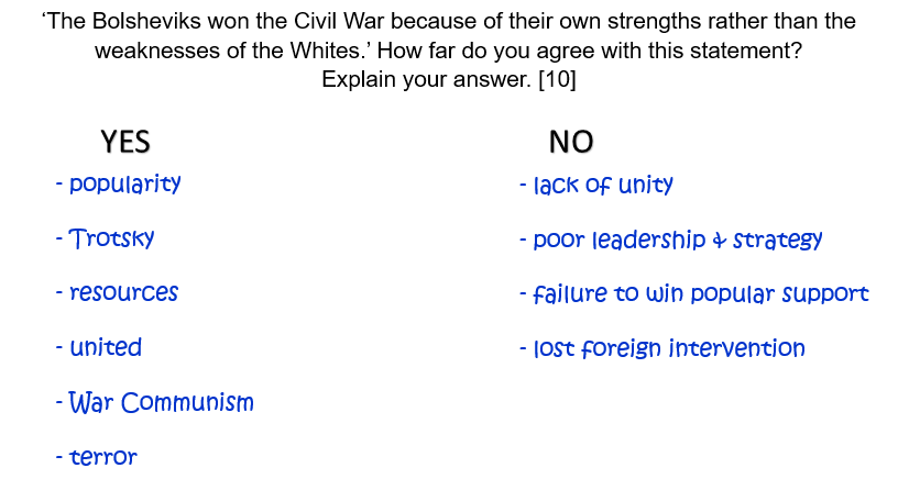 ‘The Bolsheviks won the Civil War because of their own strengths rather than the weaknesses of the Whites.’ How far do you agree with this statement? Explain your answer. [10]