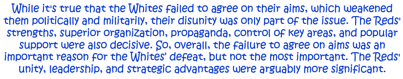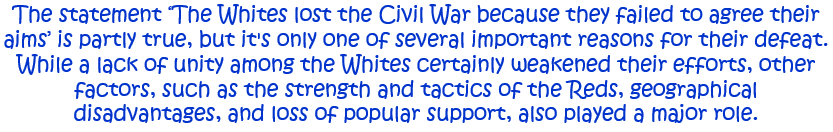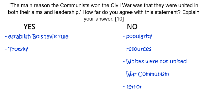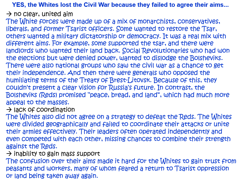 ‘The Whites lost the Civil War because they failed to agree their aims.’ How far do you agree with this statement? Explain your answer. [10]