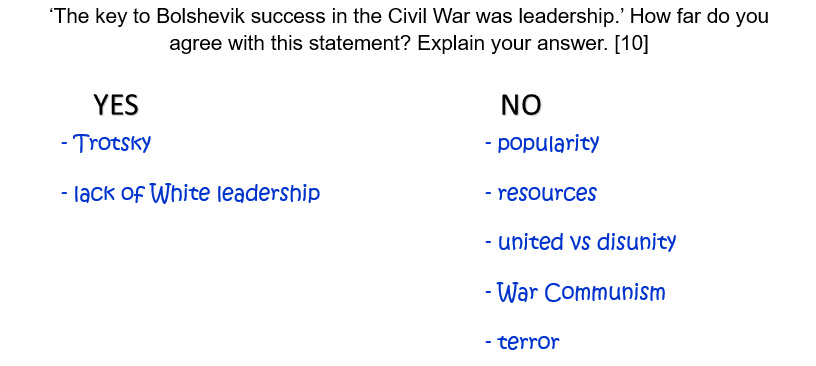 ‘The key to Bolshevik success in the Civil War was leadership.’ How far do you agree with this statement? Explain your answer. [10]