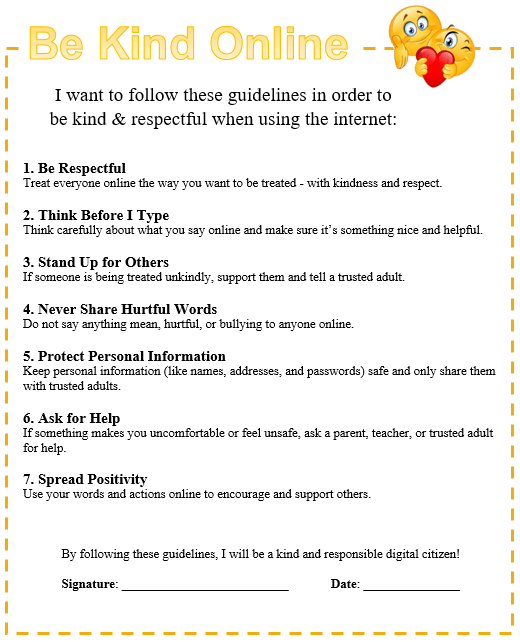 • Reinforce the importance of kindness in the digital world, just like in person. Teach students to treat others how they would like to be treated.