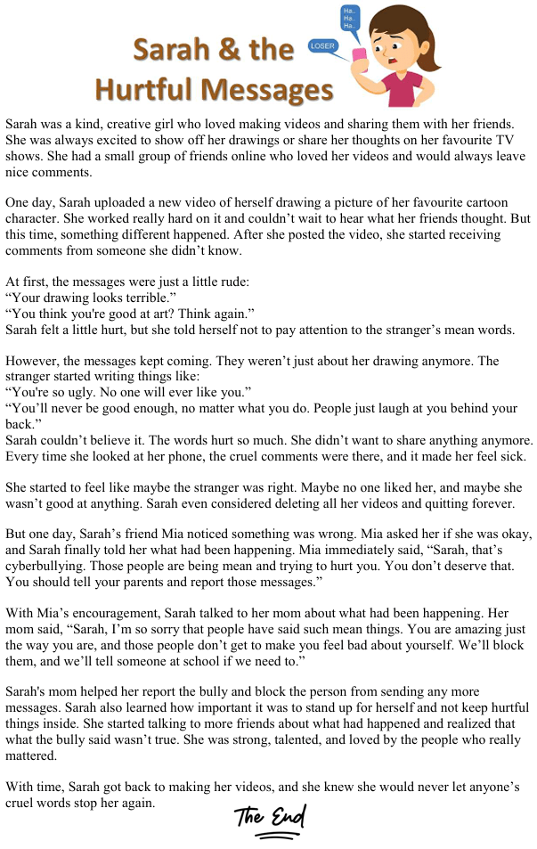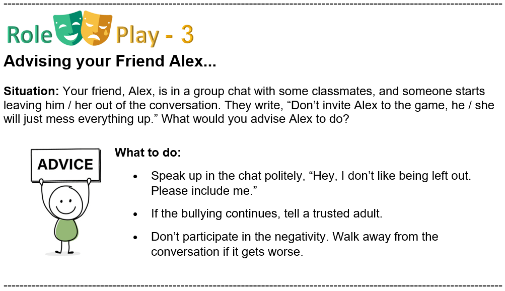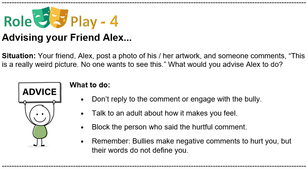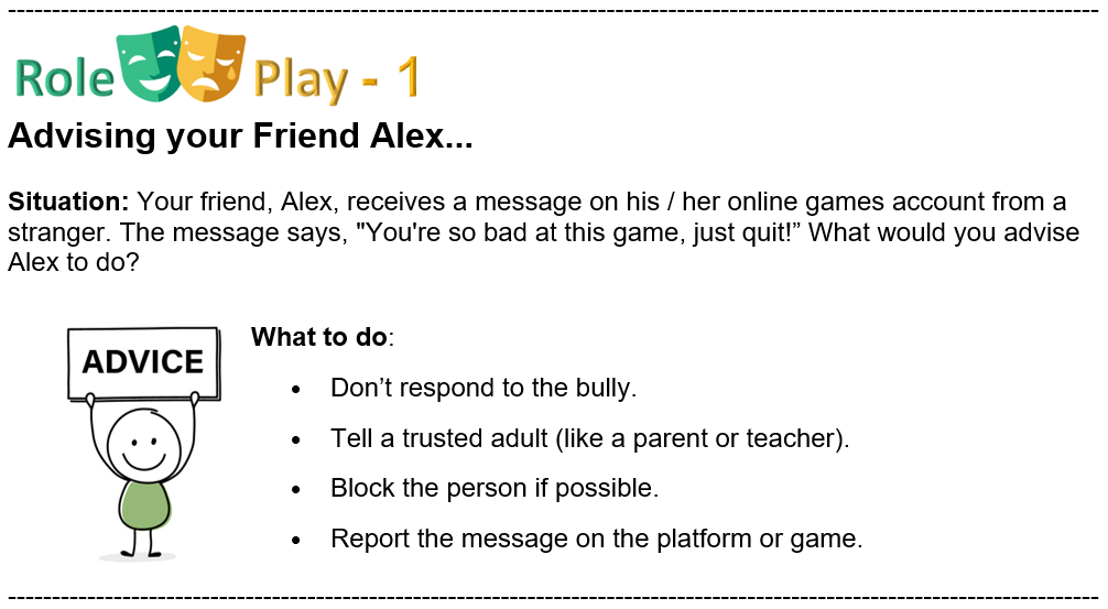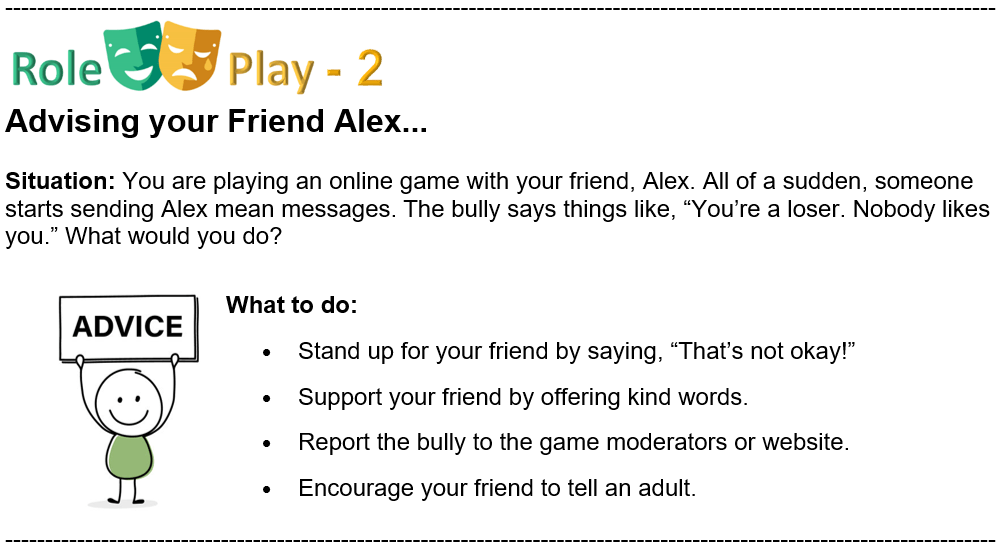 [Students act out different scenarios (e.g., receiving a mean message, seeing someone get bullied) and discuss what to do. These scenarios allow students to practice how they would respond to common cyberbullying situations. Encourage them to role-play different responses and discuss why those actions are helpful. You can also include follow-up questions to reflect on the feelings of the victim and the best ways to support them. Below are five role-play scenarios on cyberbullying, designed to help students practice different responses and discuss what to do when they encounter cyberbullying.]