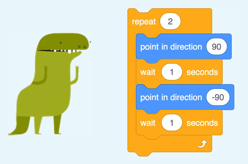 The green dinosaur uses a count-controlled loop of repeat 2, rather than an infinite loop.