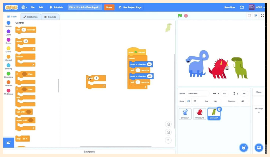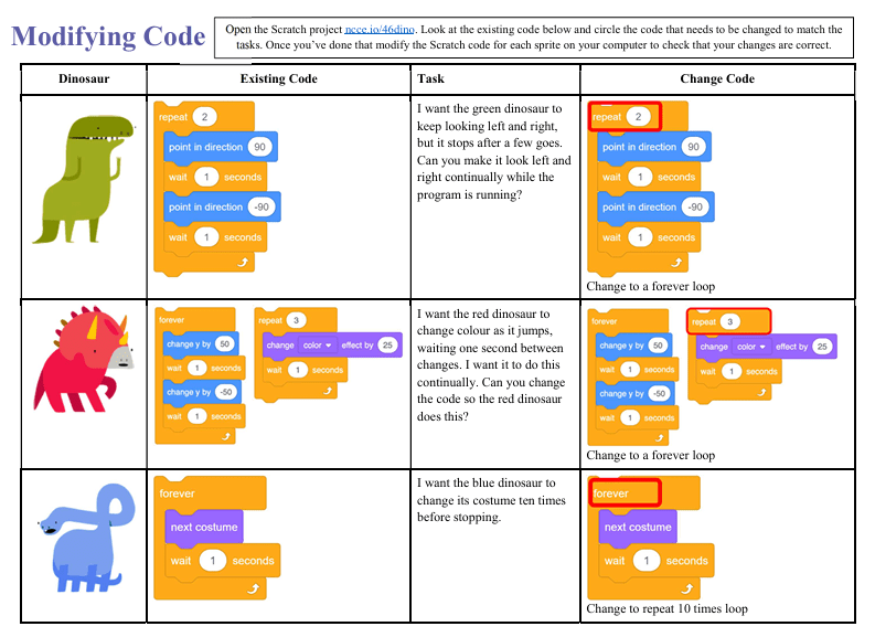 Then modify the Scratch code for each sprite (using the “same “Dancing Dinosaurs” Scratch project used previously) on a computer to check that the changes are correct.