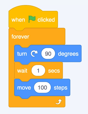 The sprite will turn, wait, and move, and keep repeating the sequence, as all the blocks are within the forever loop.