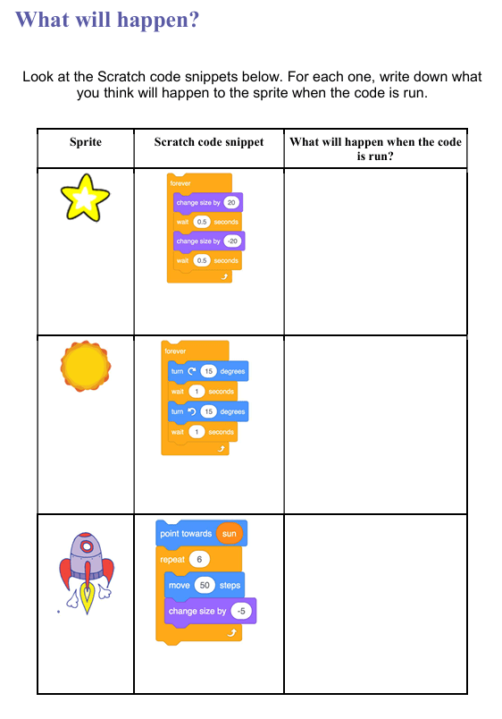 Use this worksheet to create the codes in Scratch.