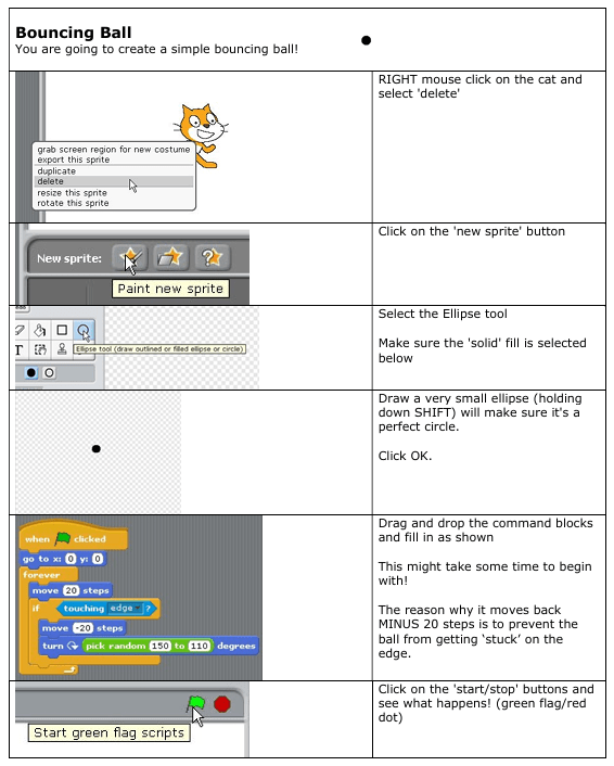 Read through the instructions provided. The use it to create codes in Scratch for your “Bouncy Ball Project”.